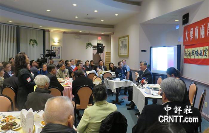 傅崐成与杨翠柏(左1)在华府侨界谈南海问题中评社记者 余东晖摄