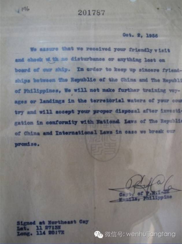 菲律宾同样主张“先占”取得南沙的岛礁主权。不过他们只敢主张南沙中的大部分岛礁,并取名叫卡拉延群岛。1956年,菲国的克罗马兄弟开办的航海学校师生出海,“发现”了11个我国南沙岛礁的“无主地”。回来报告菲政府之后,取名叫Kalayaan Islands(卡拉延群岛)。那年,台湾当局政府就立刻派海军巡逻,并抓获其船长,邀其上中国军舰,责其写下悔过书,第一句就是澄清“我们受到很友善的招待,也没有受到任何财务损失”,之后就是“我知道南沙这些岛礁是你们中国的领土,我保证以后再也不来了,若日后违背诺言,任由你们依法处置。”(请看这些图片)