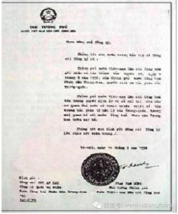 这幅图片很有名。1958年越南范文同总理正式发函给周恩来总理,在这一张有越南国徽、国玺印的公文里,范文同表示:同意、尊重中国在1958年9月4号颁布的法令,中国实施12海里领海,并且适用在包括西沙、南沙等地的中国领土。