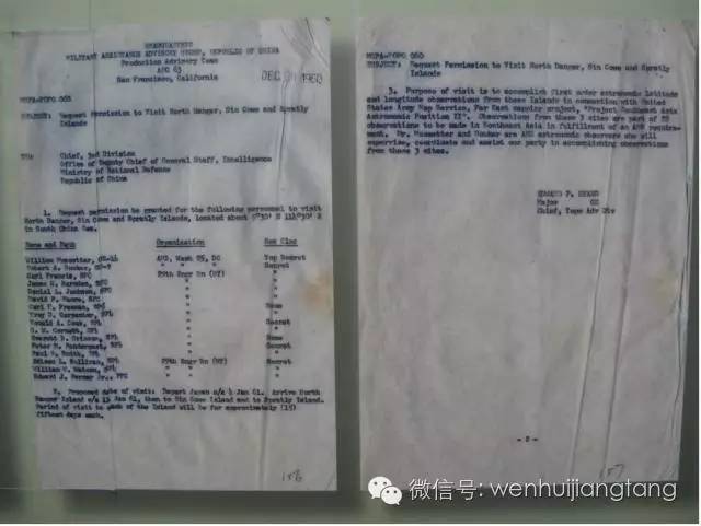 这张照片显示的是1960年12月21号,在美国加州旧金山军事顾问团总部正式发表的一份公文。公文具名发给在台北的“中华民国”的“国防部”。公文主旨:“请求许可登陆…南沙岛礁”。