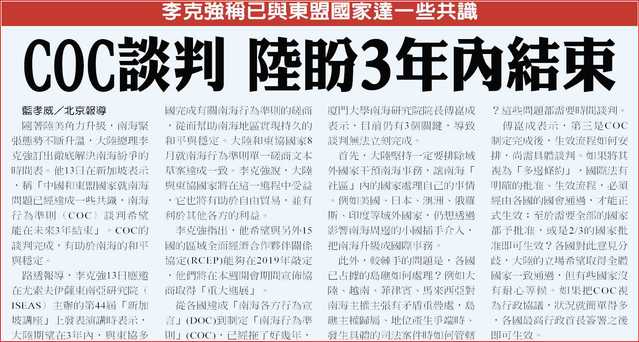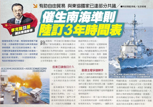随着陆美角力升级,南海紧张态势不断升温,大陆总理李克强订出彻底解决南海纷争的时间表。他13日在新加坡表示,称「中国和东盟国家就南海问题已经达成一些共识,南海行为准则(COC)谈判希望能在未来3年结束」。COC的谈判完成,有助于南海的和平与稳定。